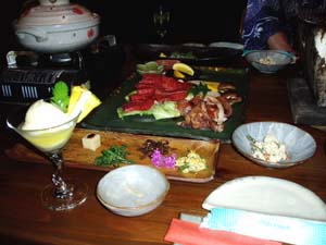 写真は食前酒にパイナップルとスターフルーツのカクテルと炭火焼。この炭火焼きの地鶏がかなり( ゚д゚)ウマー!ヨモギの天麩羅とかもこの後出て、〆は鴨鍋&雑炊でした。湯布院の宿の料理は全体的に「えっなんですか?この量は((((゚д゚;))))??」ていうのが多いのですが(亀の井別荘は腹が大変なことになりましt)ここはやや多め、くらいでなかなかに良かったし料理も美味しかったです。そうそう、ここはバーもついてて勿論のこと飲みに行ったのですがとりたてミントで作った『ミントジュレップ』はハマりそうなうまさでした。アレは美味しかったなぁ〜〜。もう腹がいっぱいで最後の一杯で〜といいつつ作ってもらったのがミントジュレップだったのですが、腹がリフレッシュするくらいに美味しかったです。近くの川で蛍を観賞したり、また温泉いったり温泉いったりして温泉を堪能しまくって就寝。