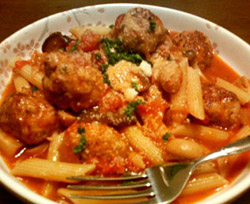 今日の晩御飯『ミートボールトマト煮込みのペンネ』