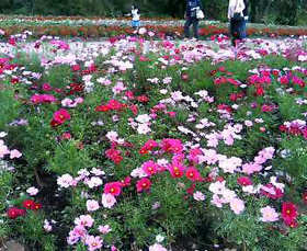ホント丁度見頃でした!満開満開。すごい綺麗でした。やっぱコスモスはいいですねぇ。秋って感じで。この普通のコスモス畑の他に、白いコスモスだけ集めたところとか、黄色(キバナコスモスじゃない)やピンクとオレンジの中間みたいな色やチョコレートコスモスといった珍しい色ばかりを集めたとこもありました。でも珍しい色のところはちょっと品種が違うのか五分咲きくらいでした。残念。他のは全部満開だったのですが。コスモス以外にもなでしこ畑やサルビア畑もあってなかなかに良かったです。