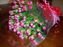 もうホントびっくりしましたよ・・・昨日は何の記念日でもなかったし。旦那曰く「ふと買って帰ろうと思った」だそうな。旦那はどうやらなんでもない時に花束を買ってくるのが好きらしい。以前もいきなりバラの花束(旦那はバラが好き)買ってきて驚いたりしました。今回はピンクのミニバラ・・・。可愛い。旦那、ありがとう。ここでも言っておこう。そして今日は外食です。ワーイ!昨日はちゃんとご飯作りましたよ、もちろん。