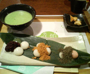 左から、あんこ・きなこ・黒ゴマの白玉団子。